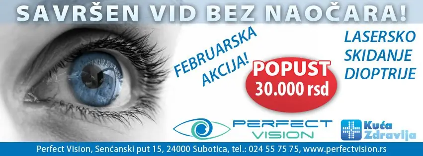 Obzirom na veliko interesovanje Perfect Vision, oftalmološka služba poliklinike Kuća Zdravlja, daruje Vam popust na lasersko korigovanje dioptrije u iznosu od 30.000 dinara.
