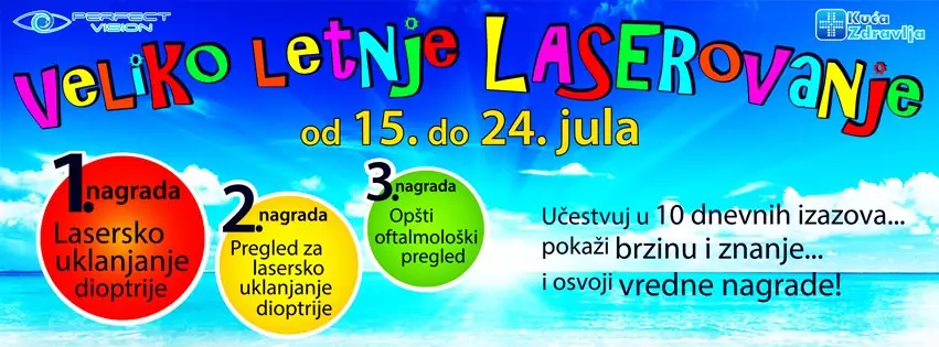 Dobrodošli u Veliko letnje LASERovanje – nagradnu igru koju smo sa velikim zadovoljstvom pripremili za sve naše drage prijatelje. Igra se sastoji od 10 dnevnih izazova u kojima je potrebno pokazati znanje i brzinu, a onaj najuspešniji će osvojiti BESPLATNU OPERACIJU LASERSKOG UKLANJANJA DIOPTRIJE! Pridružite nam se i možda baš Vi od ovog leta kažete Zbogom svojoj dioptriji! Pažljivo pročitajte pravila učešća koji se nalaze u nastavku. Srećno!