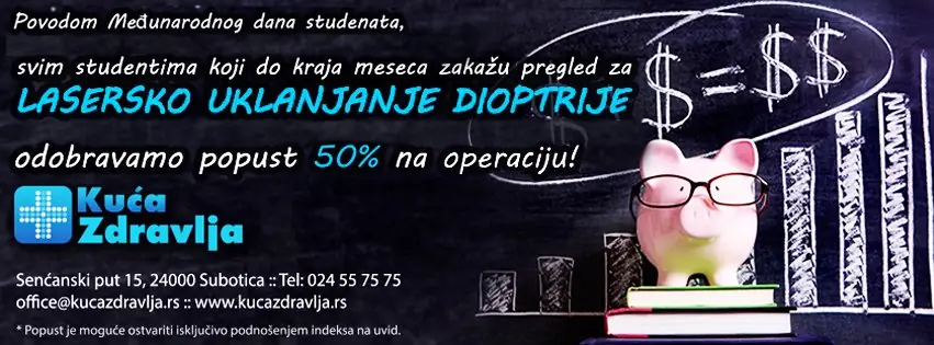 Povodom Međunarodnog dana studenata 17.11., svim studentima koji do kraja meseca zakažu pregled za lasersko uklanjanje dioptrije, odobravamo neverovatnu pogodnost – 50% popusta na LASERSKO UKLANJANJE DIOPTRIJE! Ovaj popust je moguće ostvariti samo podnošenjem indeksa na uvid.
